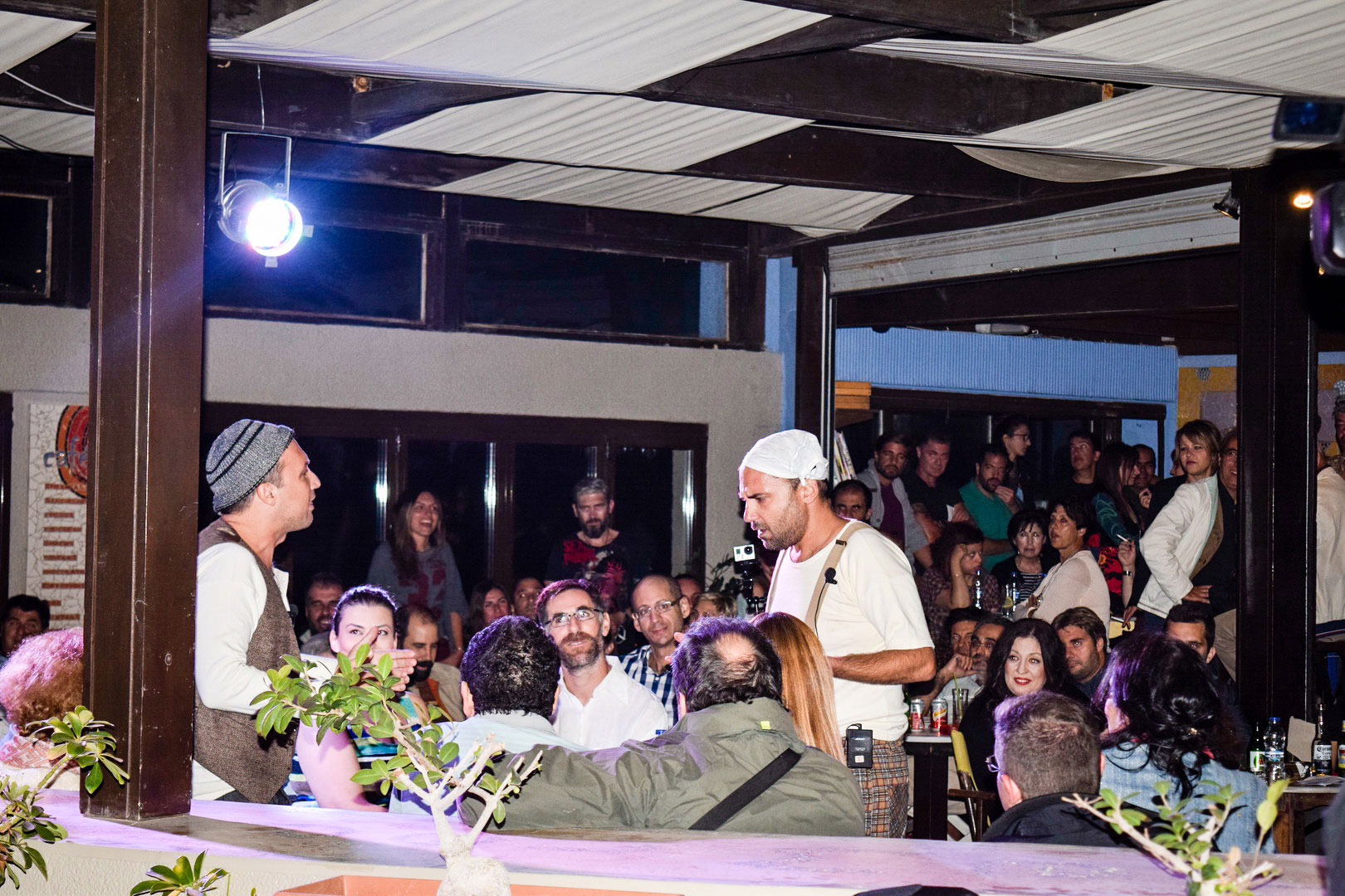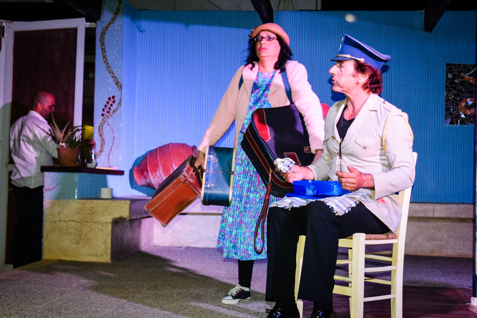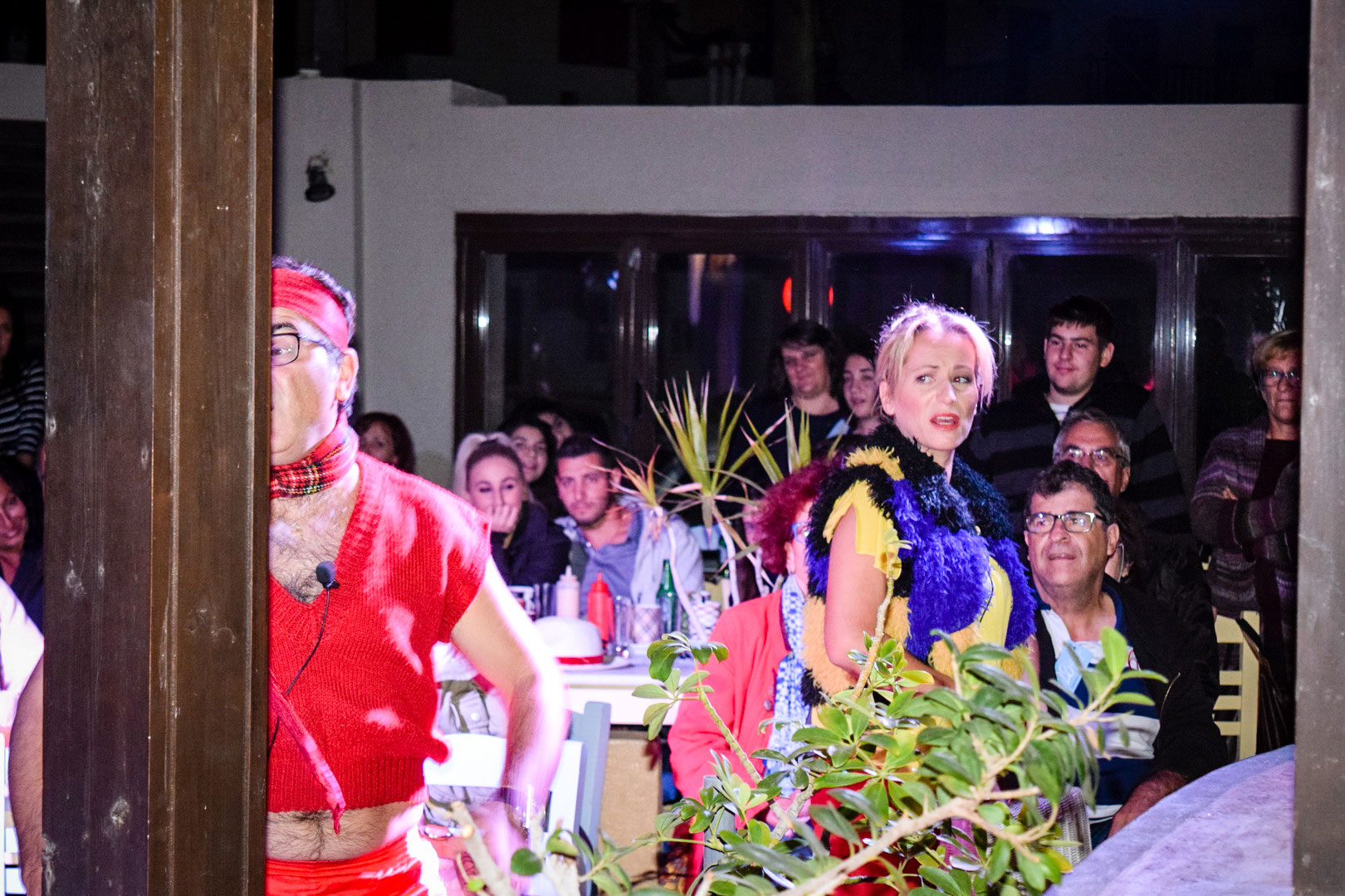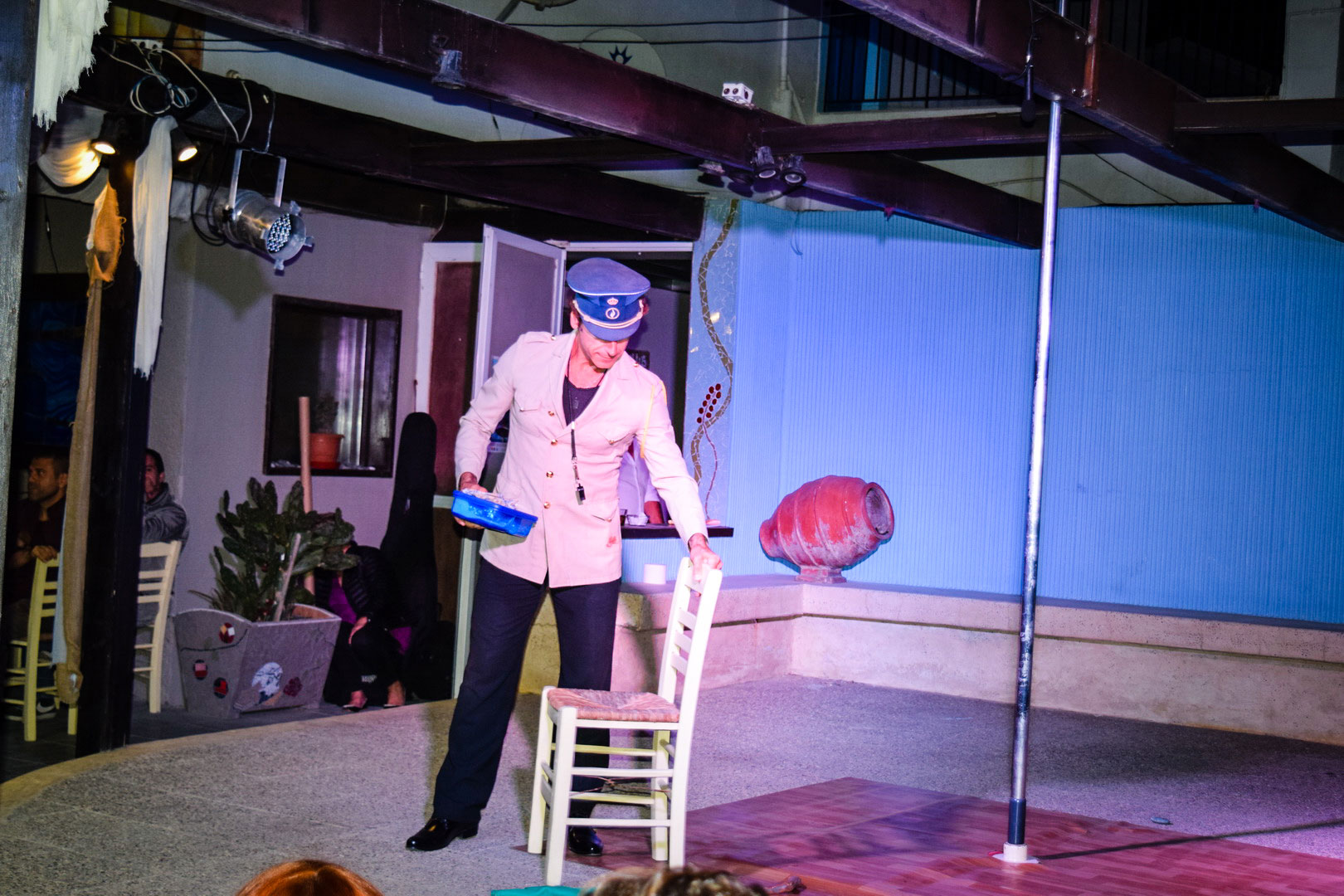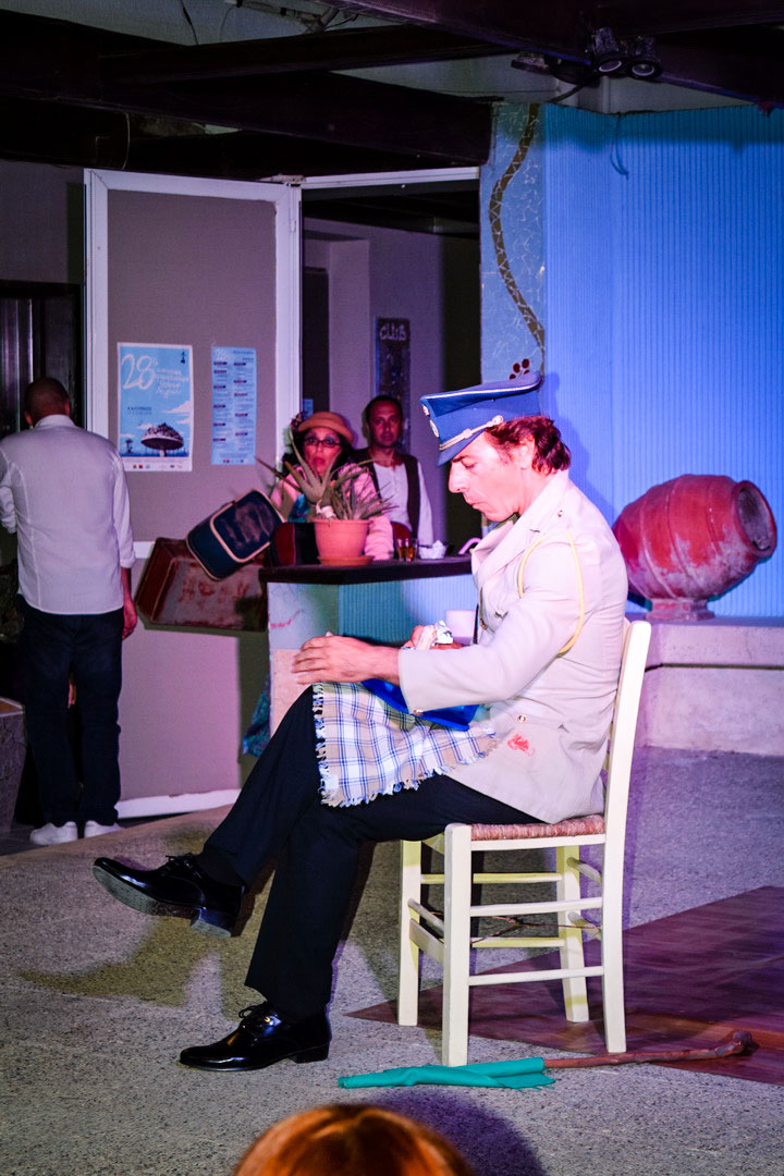 Οι ηθοποιοί της ΘΟΚ παρουσίασαν «Θεατρικά Σφινάκια» – σύντομες σκηνές των Carl Valentin, Γιώργου Σκούρτη, Γιώργου Μανιώτη – καθώς έπιναν το ποτό τους οι θαμώνες και οι επισκέπτες του νησιού.